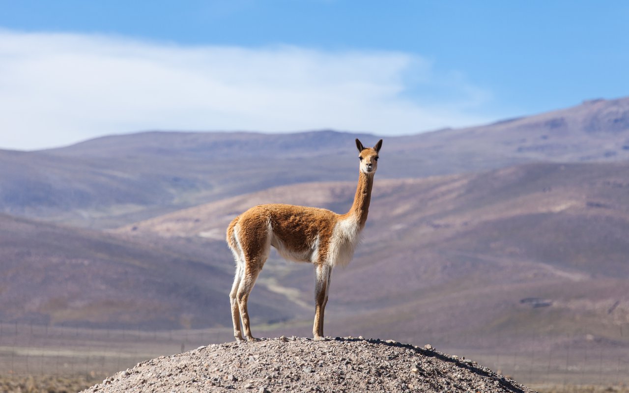 C’est le plus petit animal parmi les camélidés andins. La vigogne peur atteindre 1,30 mètres de la tête jusqu’aux sabots. Elle a une figure fine et des mouvements harmonieux.